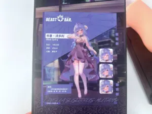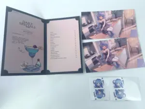 K家经典一堆周边,阿宇我这款没有那些先前特典,只有一些固有的周边赠送。一款香片、两个明信片,分中文和日文版,立绘有很小的区别。一份鸡尾酒菜单、一份纸质的背景、用于贴在保护袋上区分用的贴纸。菜单上的特调鸡尾酒我并没有找到原型,blue whisper倒是和国内一个电视剧的译名对上了,不过二者并无关联,也许只是为了贴合蓝色色调的人物做的设计。