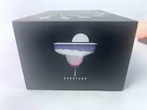 K家的包装设计一向是礼盒式的,主打的是氛围感的设计整体的色调是蓝色搭配黑色的设计,盒的前后两侧有立绘剪影和鸡尾酒杯样式的镂空。产品的生产信息则是放在了盒子的底部。