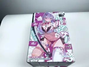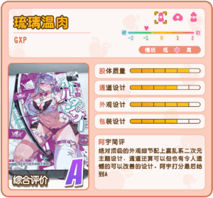 又一款礼盒类包装的产品,琉璃的包装突出一个眼花缭乱,没有一处是没有塞东西的。位于正面的自然是琉璃的主体人设,人设采用了兔女郎结合舞女的服装设计,实质上是钢管舞演员。银白长发搭配梅川内库的银纹和黑色蕾丝内搭,纯洁与瑟琴的经典反差设计。