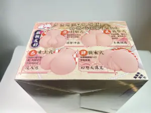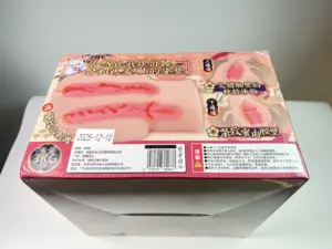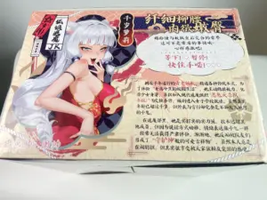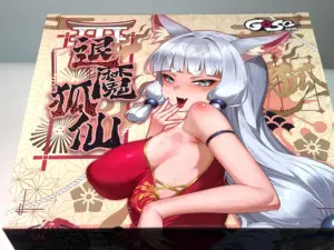 这次的狐仙采用了米黄色的底色,经典的榻榻米会有的颜色。整体的元素分布也是选择了臀模常用的立绘切一半,屯单独放一面的设计。位于整个盒子正上方的是狐仙的上半身立绘,典中典的白色长发和多毛狐耳,霓虹的二次元狐仙基本上都是这样的形象。狐仙身上这一身应该是旗袍的一种变体,开叉开的不算高,刚刚开到内库的绳子处。最特别的还是上半身的双入实在是过于挺翘了一些。