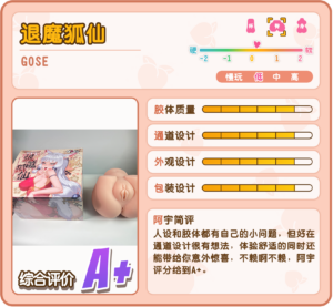 通道啊通道,狐仙的通道怎么说呢,体验感很奇妙。前庭的刺激度不高,处在低刺激的水平,前段的肉段组合会提供相当不错的连续剐蹭感,而在中段的时候突然通道就变紧了,你会有一种短暂的碰壁感,就像在用拿下带储女设计的杯杯的时候顶在了纯洁环上一样。用力突破后不会有纯洁环那种豁然开朗的感觉,而是一种内壁正在朝你挤压过来的感觉,整个后段都是偏紧的设计,底部的子贡也采用了偏紧的设计,挤压感还是很强烈的。感觉上就像是前一秒还在嘴硬的狐仙被你顶到了什么铭感的地方然后大幅度的缩紧了,倒是有了一种表面高傲的狐仙实则很好搞定的奇妙反差感。后庭这快的体验就是合格的颗粒感和推肉感,虽然没什么很有特色的设计,但足够冲个爽了。